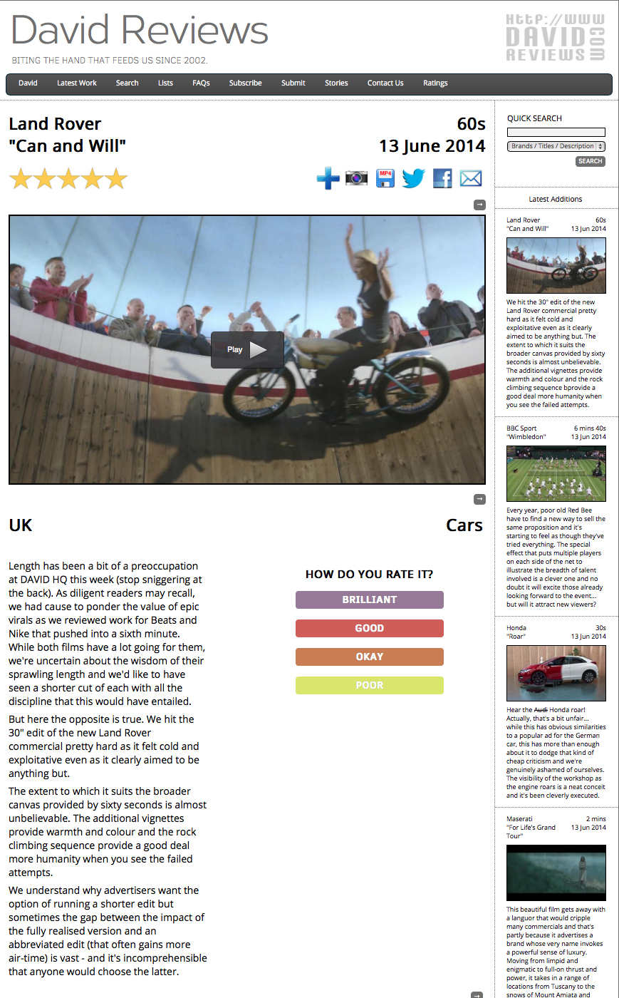 Some good reviews of the Land Rover Can And Will film coming in… Ad of the Day on The Drum too. Who says Friday 13th is unlucky...
